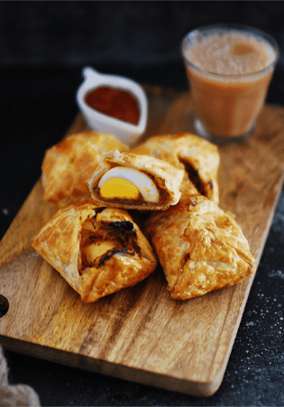 Crispy, golden puff pastry filled with spicy chicken masala.